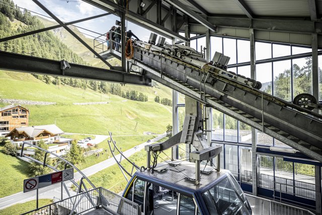 Der Betriebsleiter der Bergbahnen Samnaun führt durch den Maschinenraum der weltersten Doppelstockbahn und erklärt die ausgeklügelte Technik.